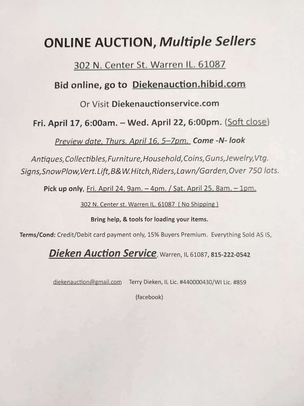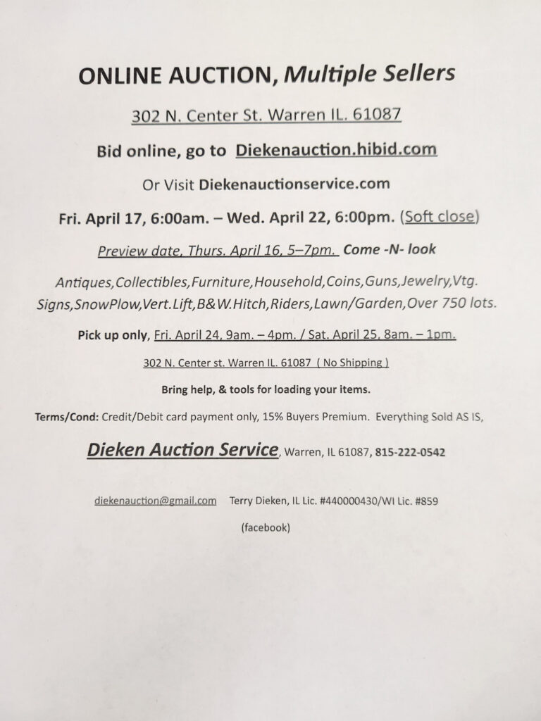 No Shipping – Pick-up Only, Friday, April 24th, 9 am-4 pm, and Saturday, April 25th, 8 am-1 pm at 302 N Center St, Warren, IL 61087